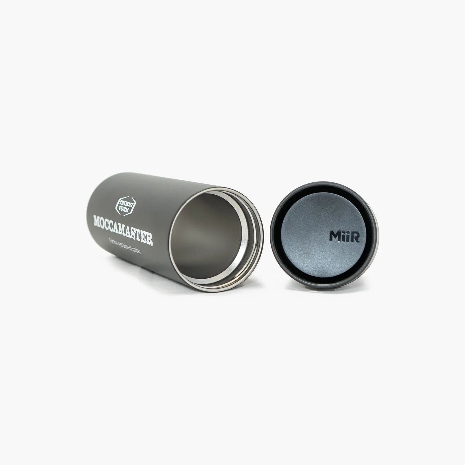 The MiiR 360 Traveler boasts Thermo 3D® double-wall vacuum insulation crafted from 18/8 food-grade stainless steel. Its innovative 360 lid opens with a center press, allowing sips from any side—perfect for on-the-go convenience. It's finished in a durable Matte Black Hardshell powder coat and features a white Technivorm-Moccamaster logo.